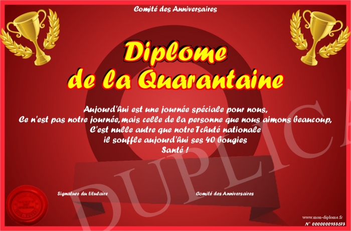 Envoyez par email votre Diplôme de la Quarantaine personalisé