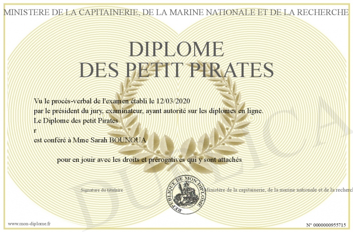 Envoyez par email votre Diplôme des petit Pirates personalisé
