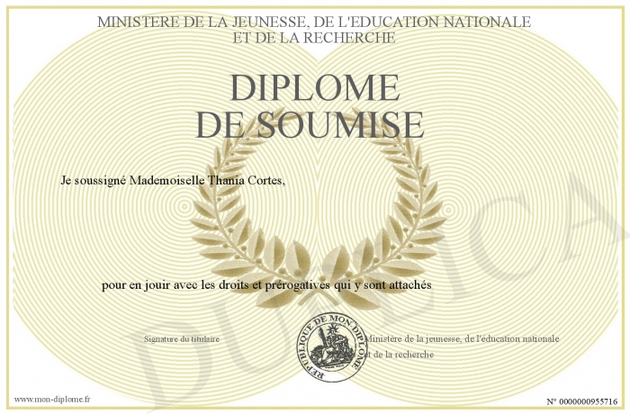 Envoyez par email votre Diplôme de Soumise personalisé