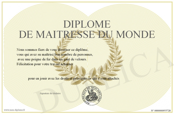 Envoyez par email votre Diplôme de Maitresse du Monde personalisé