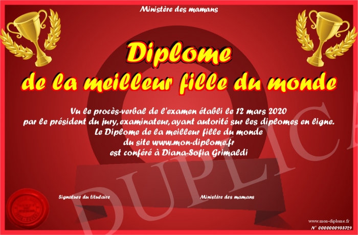 Envoyez par email votre Diplôme de la meilleur fille du monde personalisé