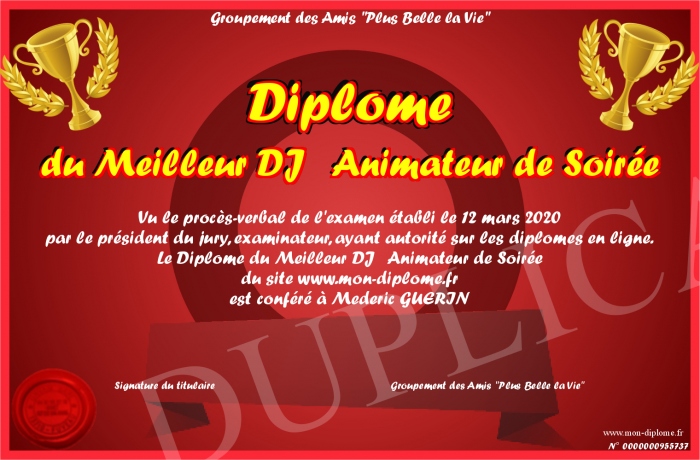 Envoyez par email votre Diplôme du Meilleur DJ Animateur de Soirée personalisé