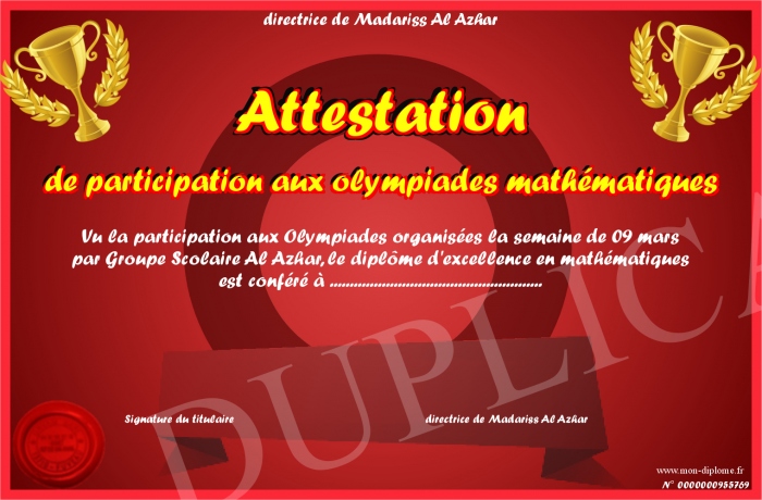 Envoyez par email votre Attestation de participation aux olympiades mathématiques personalisé