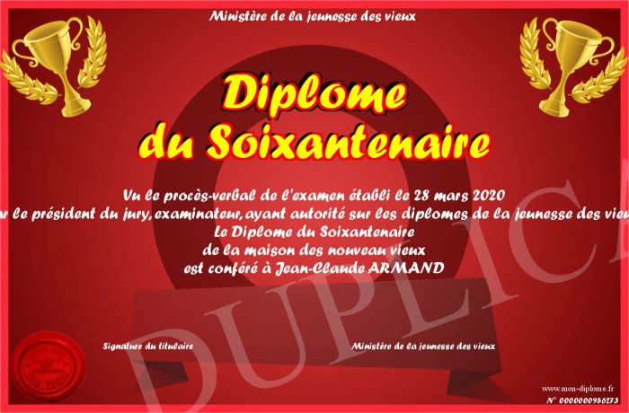 Envoyez par email votre Diplôme du Soixantenaire personalisé