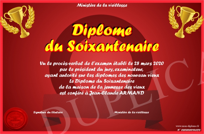 Envoyez par email votre Diplôme du Soixantenaire personalisé