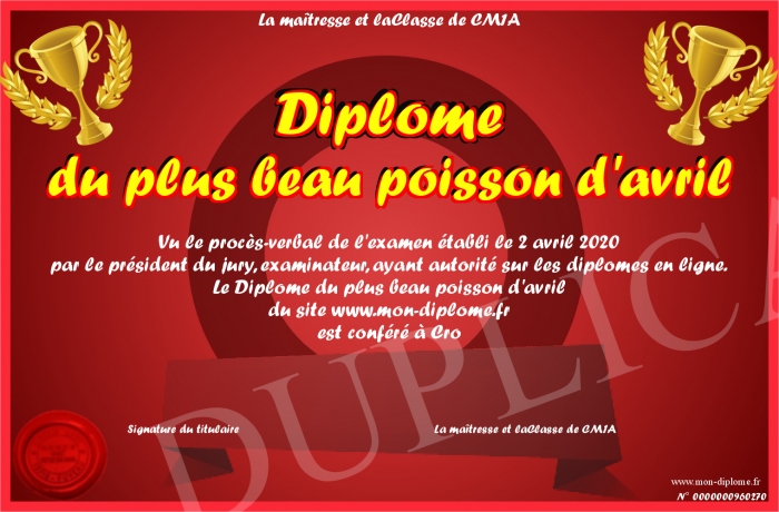 Envoyez par email votre Diplôme du plus beau poisson d'avril personalisé