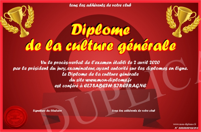 Envoyez par email votre Diplôme de la culture générale personalisé