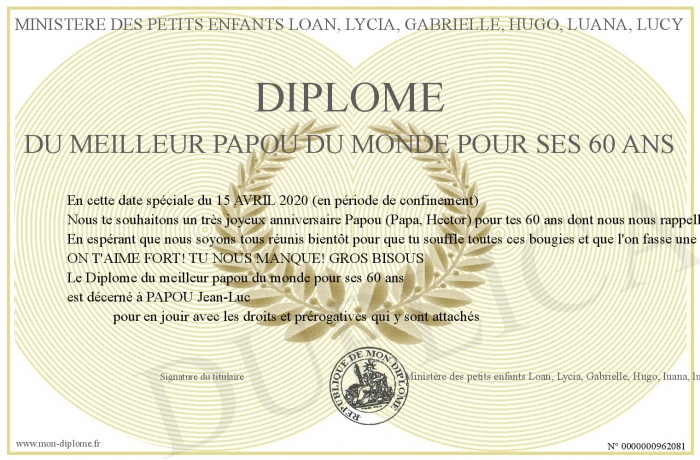 Envoyez par email votre Diplôme du meilleur papou du monde pour ses 60 ans personalisé
