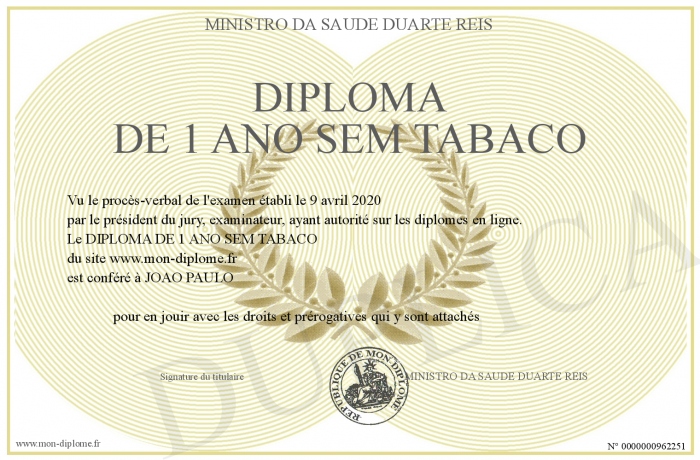 Envoyez par email votre DIPLOMA DE 1 ANO SEM TABACO personalisé
