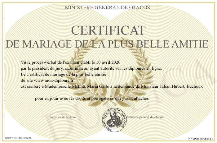 Envoyez par email votre Certificat de mariage de la plus belle amitié personalisé