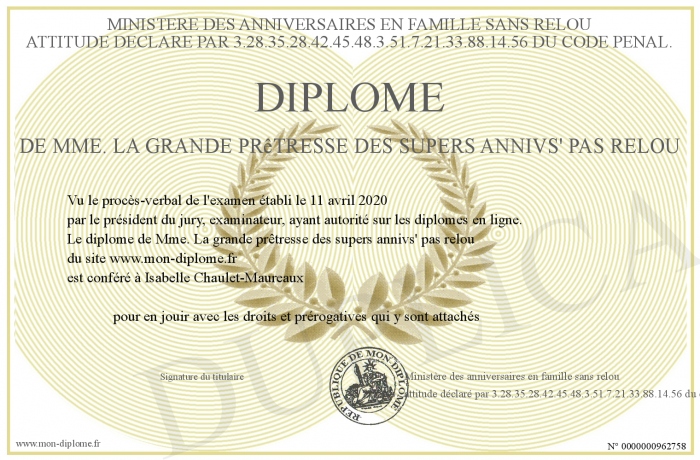 Envoyez par email votre diplôme de Mme. La grande prêtresse des supers annivs' pas relou personalisé