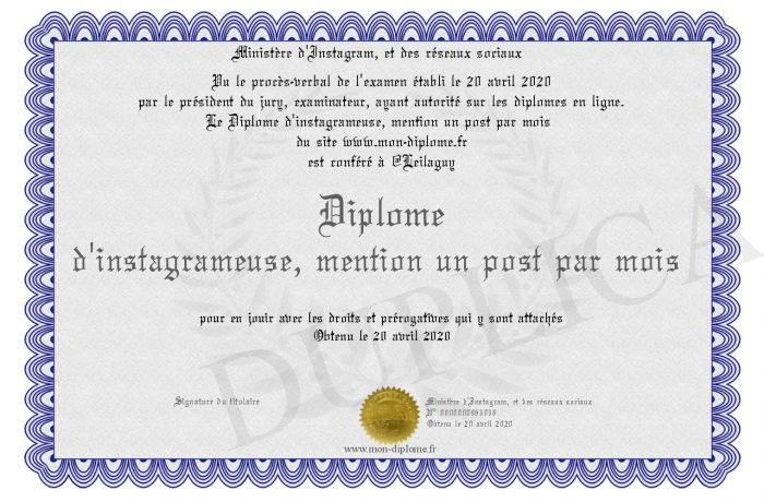 Envoyez par email votre Diplôme d'instagrameuse, mention un post par mois personalisé