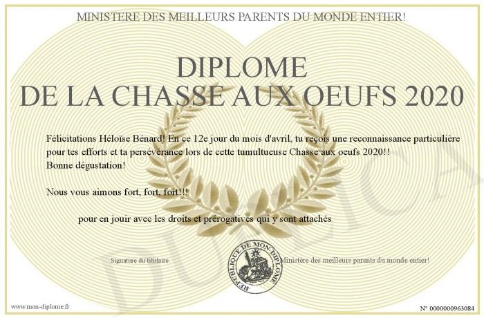 Envoyez par email votre Diplôme de la Chasse aux oeufs 2020 personalisé