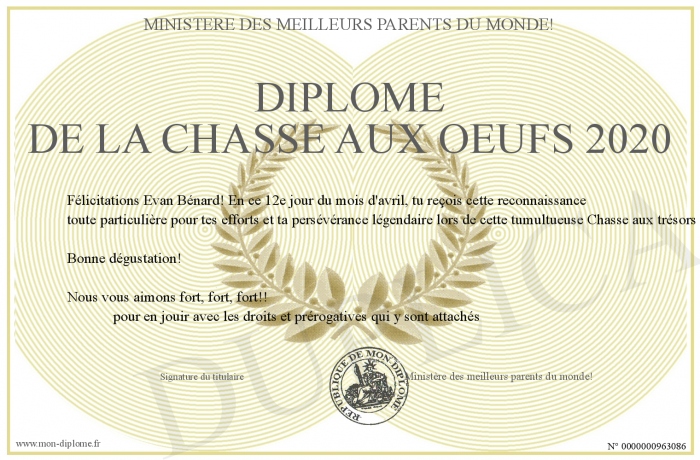 Envoyez par email votre Diplôme de la Chasse aux oeufs 2020 personalisé