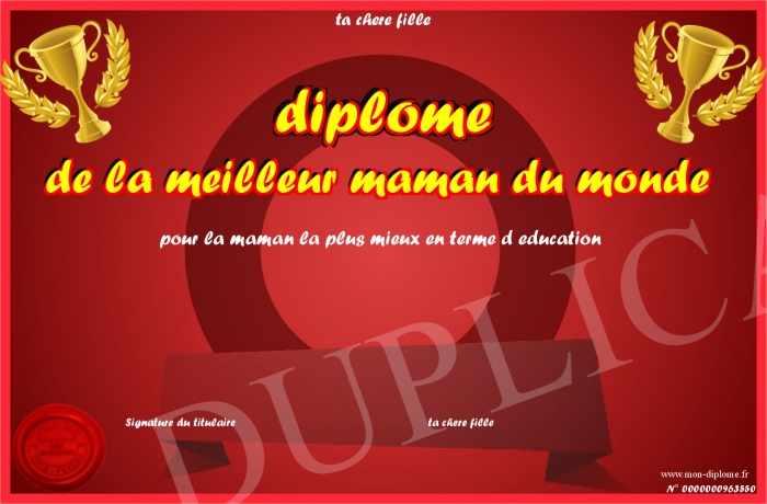 Envoyez par email votre diplome de la meilleur maman du monde personalisé