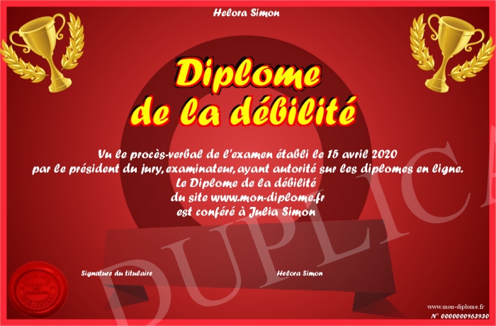 Envoyez par email votre Diplôme de la débilité personalisé