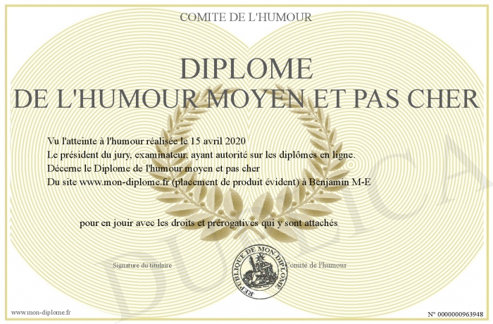 Envoyez par email votre Diplôme de l'humour moyen et pas cher personalisé