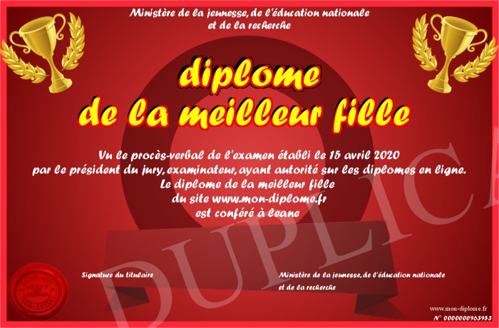 Envoyez par email votre diplome de la meilleur fille personalisé