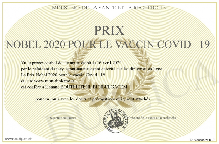 Envoyez par email votre Prix Nobel 2020 pour le vaccin Covid 19 personalisé