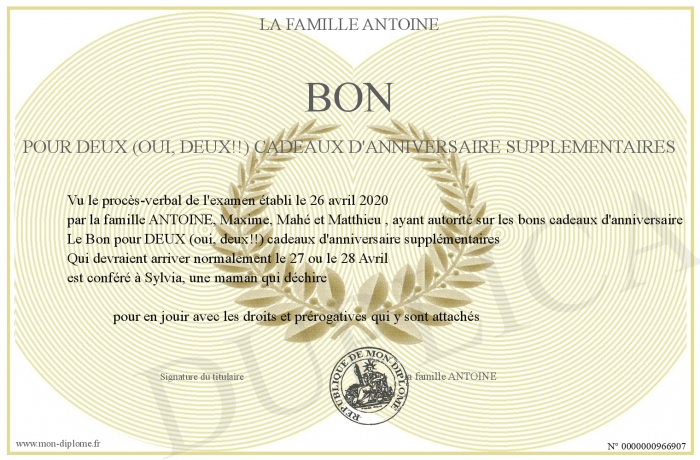 Envoyez par email votre Bon pour DEUX (oui, deux!!) cadeaux d'anniversaire supplémentaires personalisé