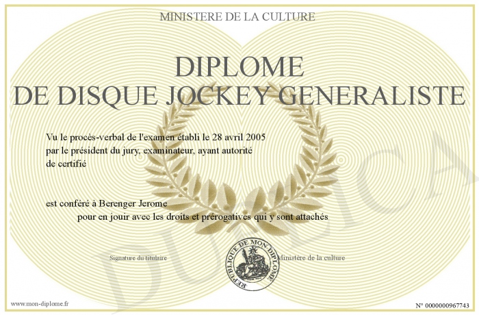Envoyez par email votre Diplôme de disque jockey généraliste personalisé