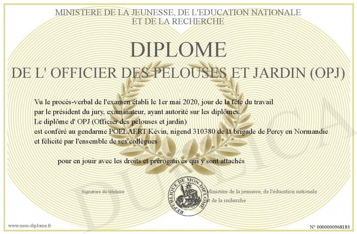 Envoyez par email votre Diplôme de l' officier des pelouses et jardin (OPJ) personalisé