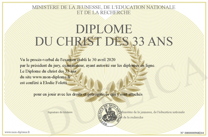 Envoyez par email votre Diplôme du christ des 33 ans personalisé