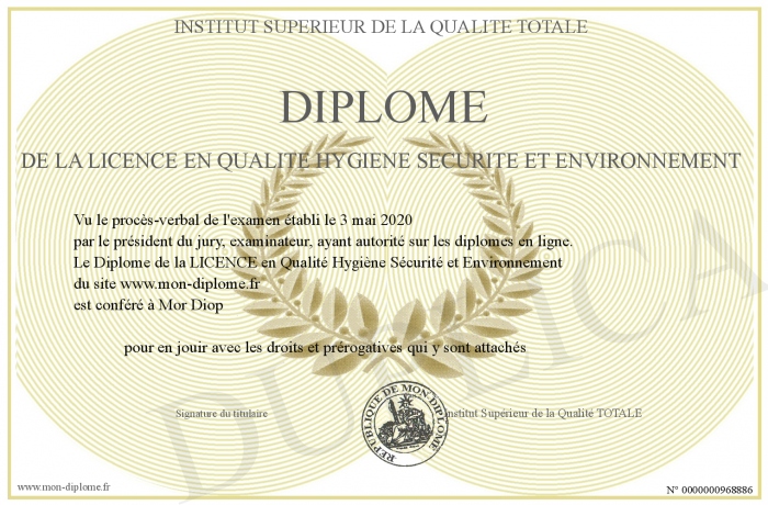 Envoyez par email votre Diplôme de la LICENCE en Qualité Hygiène Sécurité et Environnement personalisé