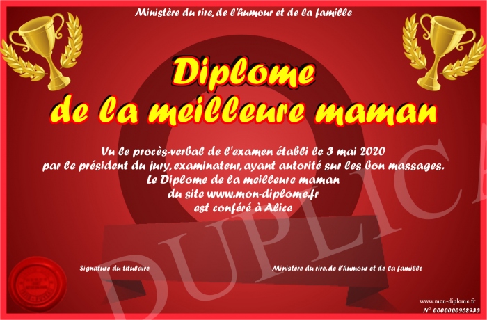 Envoyez par email votre Diplome de la meilleure maman personalisé