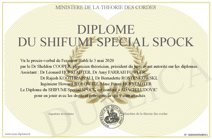 Envoyez par email votre Diplôme du SHIFUMI Special SPOCK personalisé