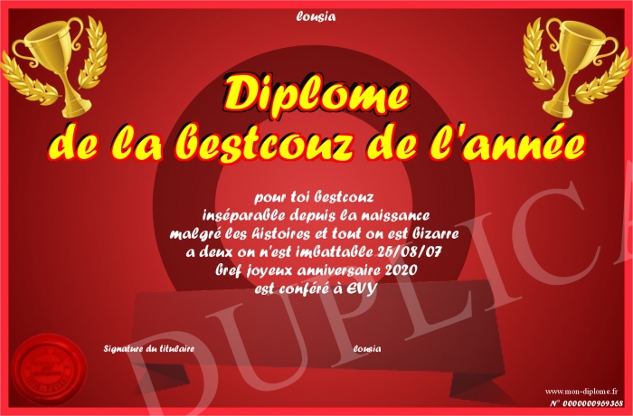 Envoyez par email votre Diplôme de la bestcouz de l'année personalisé