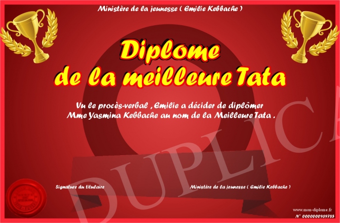 Envoyez par email votre Diplôme de la meilleure Tata personalisé