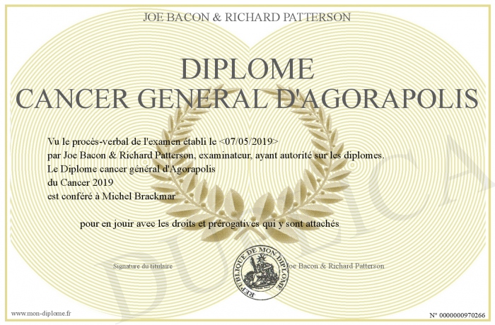 Envoyez par email votre Diplôme cancer général d'Agorapolis personalisé