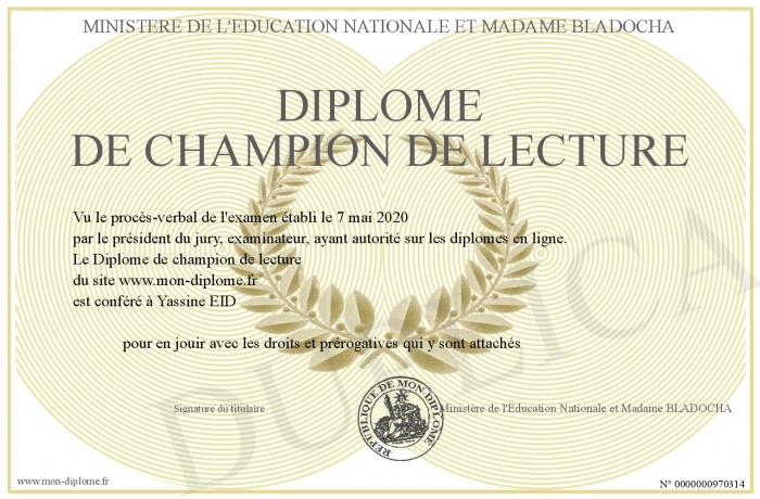 Envoyez par email votre Diplôme de champion de lecture personalisé