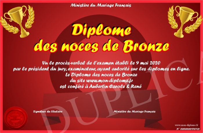 Envoyez par email votre Diplôme des noces de Bronze personalisé