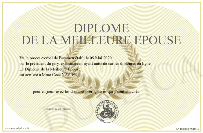 Envoyez par email votre Diplôme de la meilleure épouse personalisé