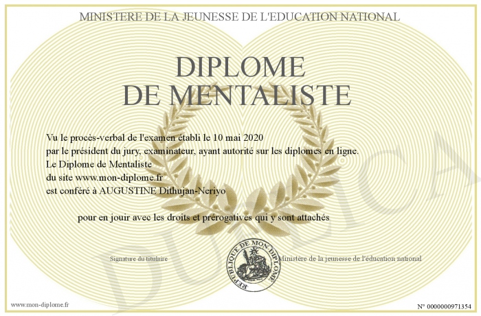 Envoyez par email votre Diplôme de Mentaliste personalisé
