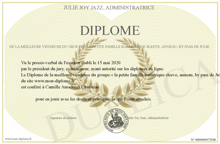 Envoyez par email votre Diplôme de la meilleure vendeuse du groupe « la petite famille bariatrique sleeve, anneau, by pass de Julie personalisé