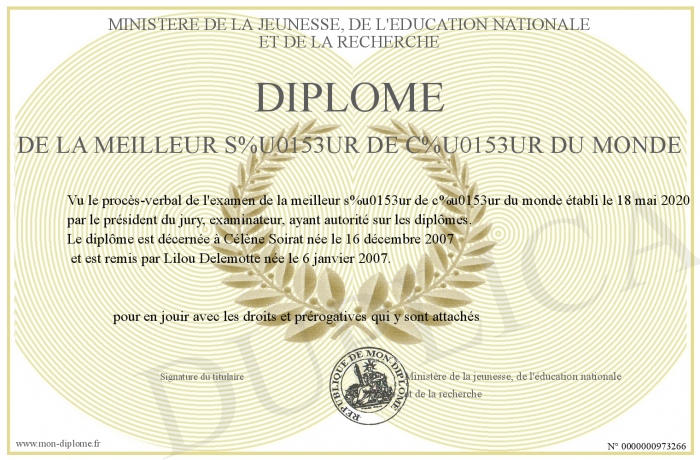Envoyez par email votre Diplôme de la meilleur soeur de coeur du monde personalisé