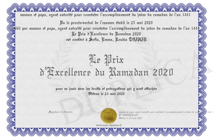 envoyé par le maman et papa, ayant autorité pour constater l'accomplissement du jeûne du ramadan de l'an 1441 !
