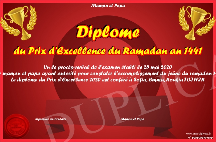 Envoyez par email votre Diplôme du Prix d'Excellence du Ramadan an 1441 personalisé