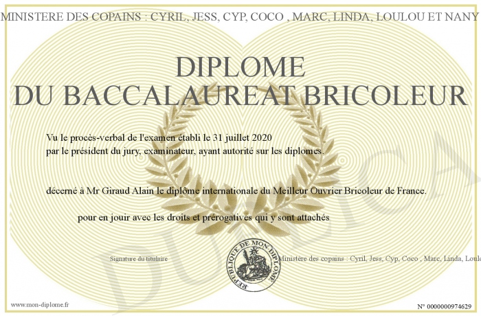 Envoyez par email votre Diplôme du baccalaureat bricoleur personalisé