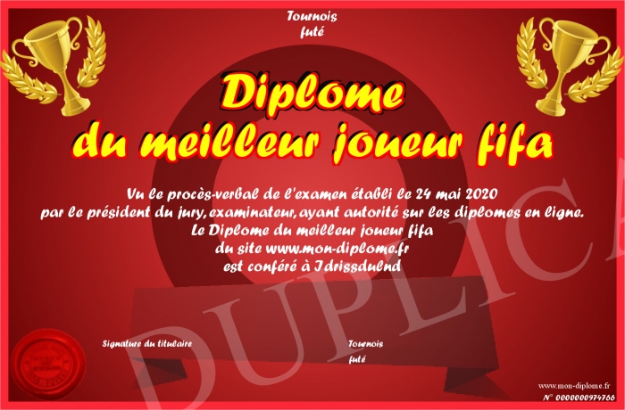 Envoyez par email votre Diplôme du meilleur joueur fifa personalisé