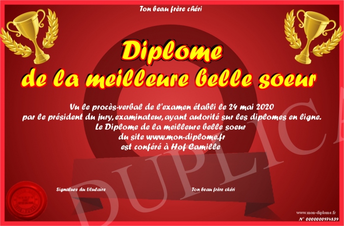 Envoyez par email votre Diplôme de la meilleure belle soeur personalisé