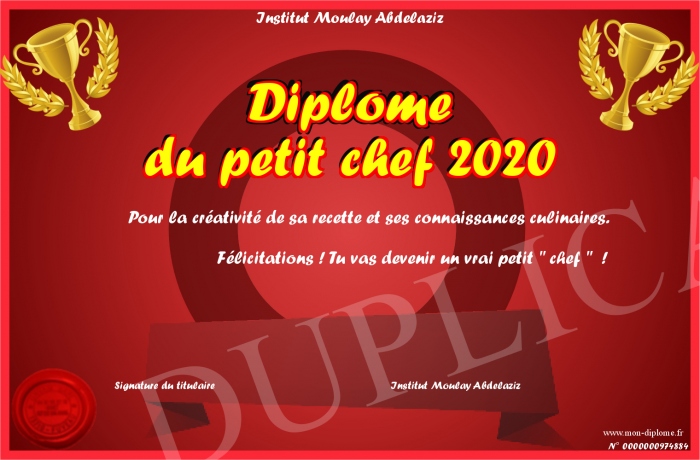 Envoyez par email votre Diplôme du petit chef 2020 personalisé