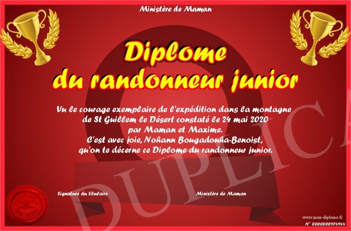 Envoyez par email votre Diplôme du randonneur junior personalisé