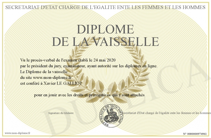 Envoyez par email votre Diplôme de la vaisselle personalisé