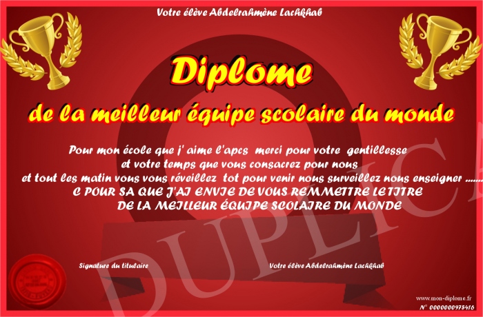 Envoyez par email votre Diplôme de la meilleur équipe scolaire du monde personalisé