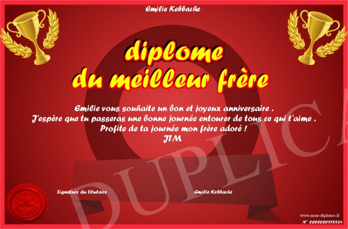 Envoyez par email votre diplôme du meilleur frère personalisé