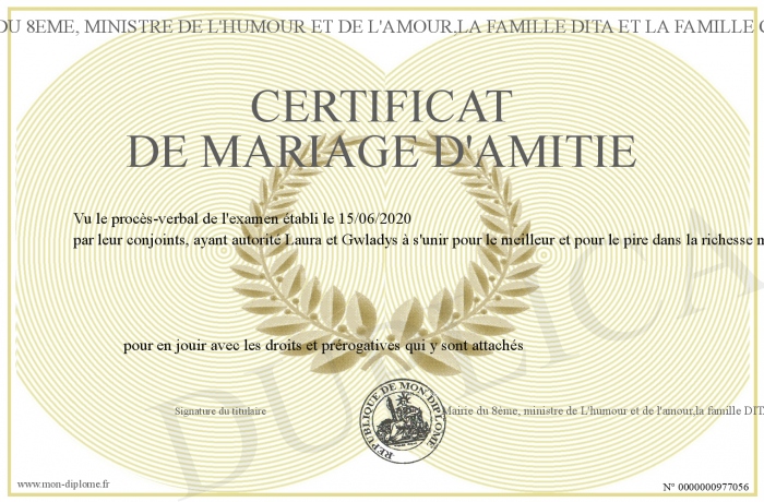 Envoyez par email votre Certificat de mariage d'amitié personalisé